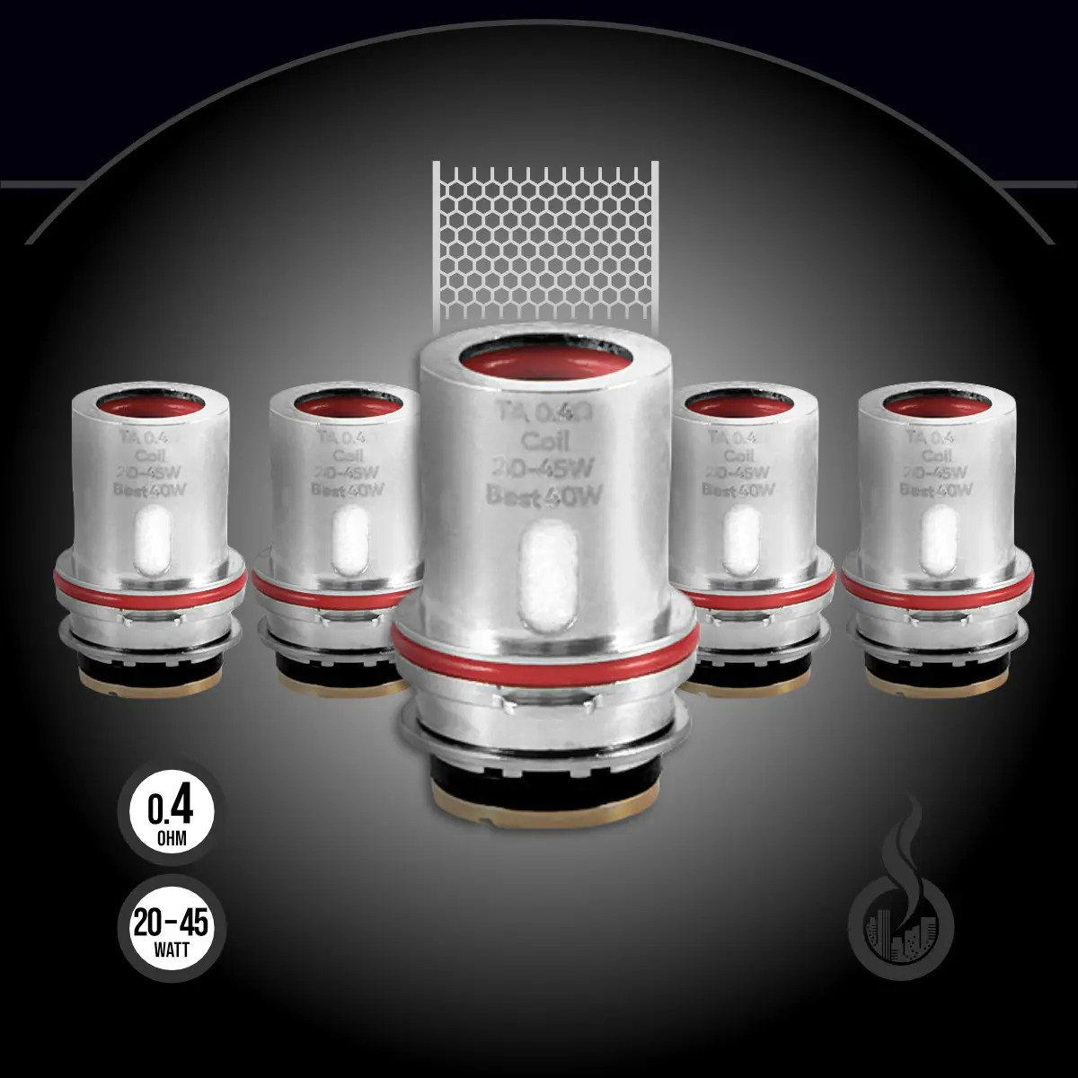 - TA Coil 0.4 Ohm für DL: Arbeitet in einem Bereich von 25 bis 45 Watt. Eine Leistung von 40 Watt ist vom Hersteller empfohlen.