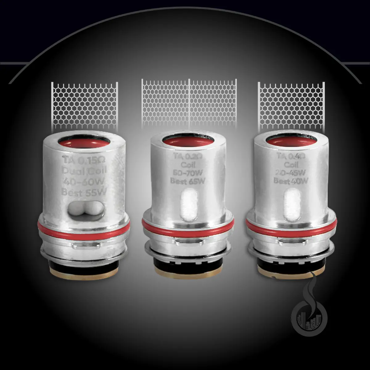 - TA Coil 0.2 Ohm für DL: Performt im Leistungsbereich zwischen 50 und 70 Watt. Die empfohlene Leistung ist 65 Watt. Dieser Coil hat einen dualen Mesch-Einsatz und ist dadurch etwas geschmacksintensiver.
