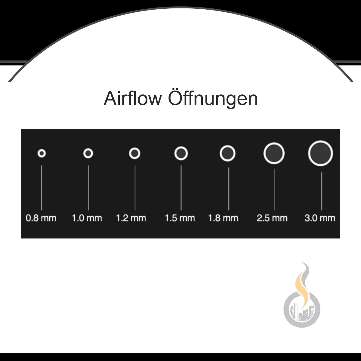 Um die Luftzufuhr perfekt einzustellen wurde ein Stellring verbaut welcher mit Öffnungen von 0.8 bis zu 3.0 mm eingestellt wird. Durch 7 unterschiedliche Bohrungen kann hier sehr individuell angepasst werden.