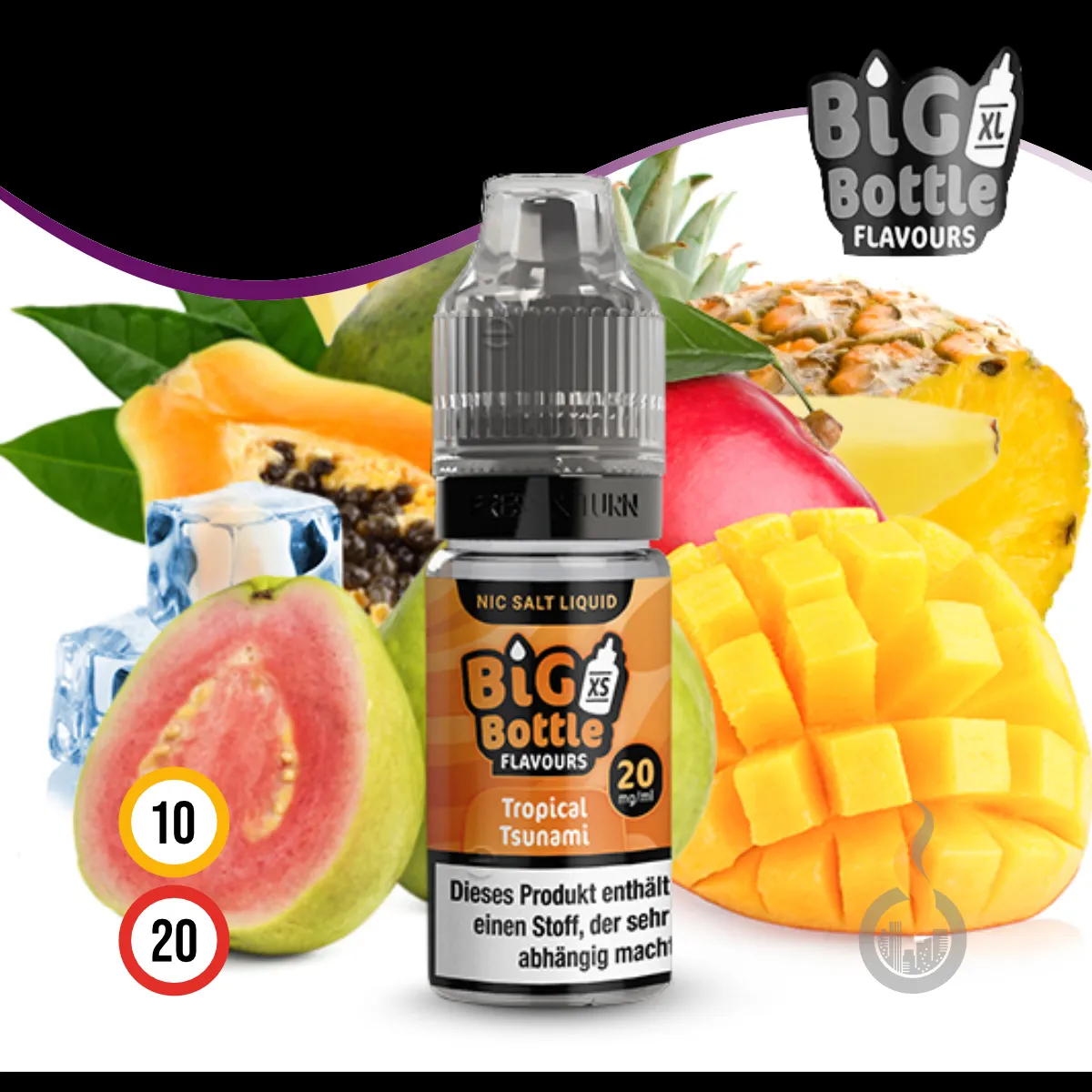 Das Nikotinsalzliquid BIG BOTTLE Tropical Tsunami ist ein Mix aus frischer Mango und lecker saftiger Guave, dazu kommt eine Papaya mit weiteren Tropenfrüchten.