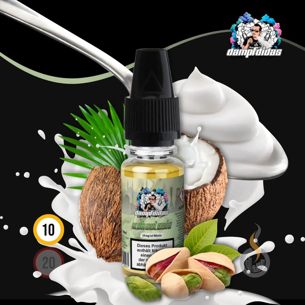 Das DAMPFDIDAS Kokostazie Nikotinsalz Liquid ist ein Mix aus feinen Kokosnussstücken, gerösteten Pistazien, einer feinen Sahnecreme und Milch. Verfügbar in den Nikotinstärken 10 und 20 mg mit Nikotinsalz (sofern auf Lager).