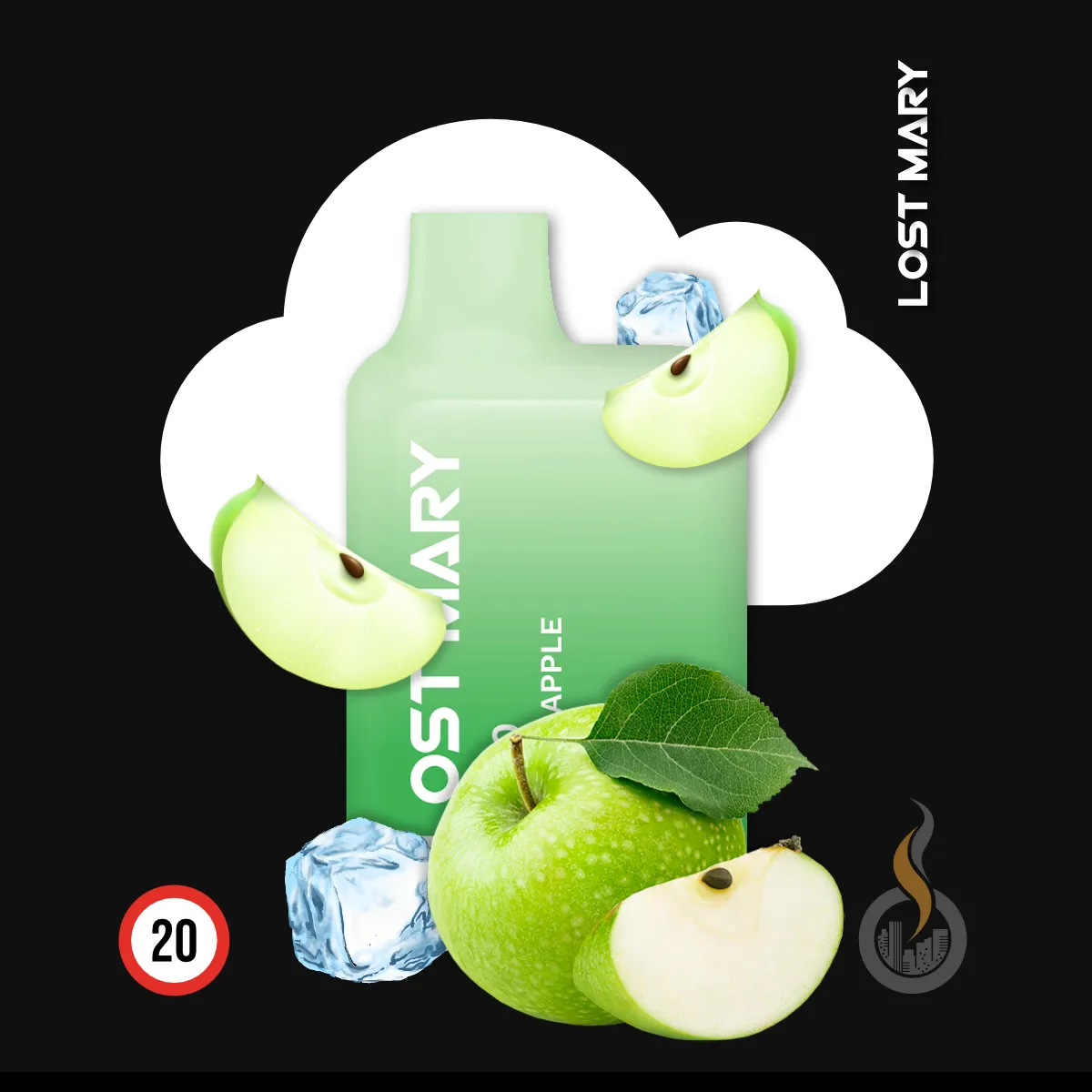 Einweg Vape (E-Zigarette) LOST MARY Crazy Apple mit 2 ml befülltem Pod-Tank und 20 mg/ml Nikotin-Salz für bis zu 600 Züge/Puffs. Bestens geeignet zum Probieren, für zwischendurch, zum Umsteigen vom Rauchen zum Dampfen.