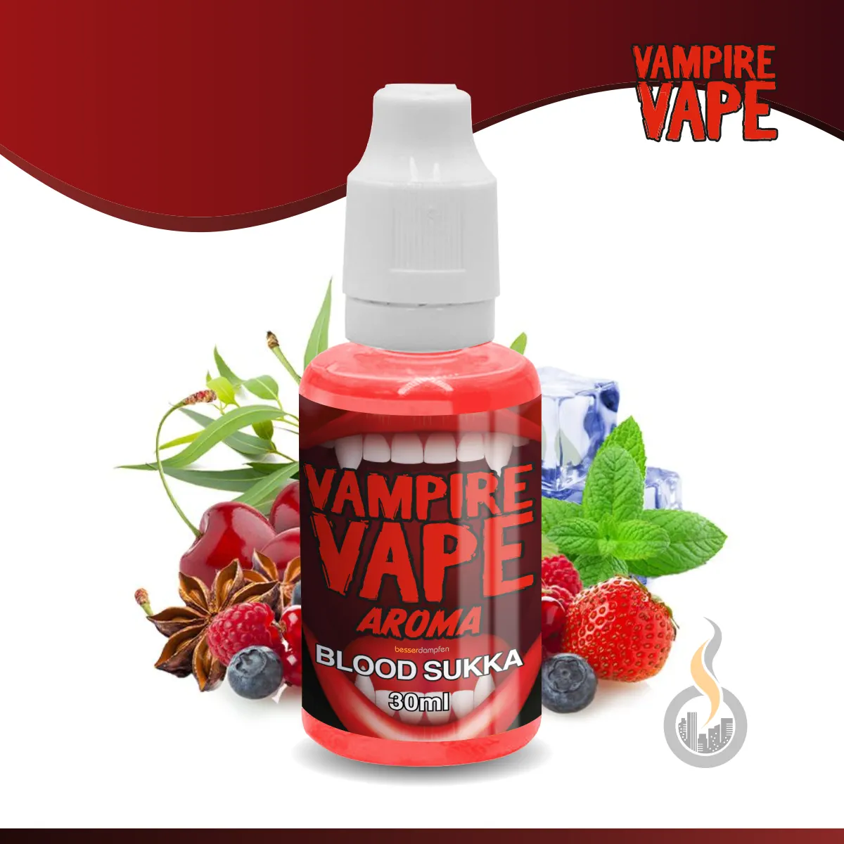 Das Liquid-Aroma VAMPIRE VAPE Blood Sukka ist eine „blutige“ Aroma-Kombination aus Kirschen, Beeren, roten Früchten, süßem Eukalyptus, Anis und Menthol.